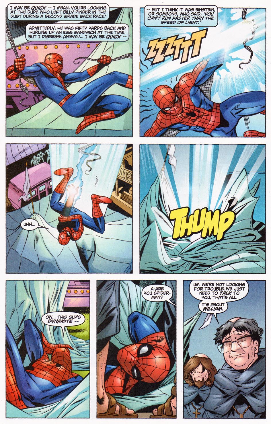 Spider-Man, as you might imagine has a lot of bullet-timing feats. Some of the most impressive ones include dodging a bullet moving 4,000 feet per second (1,219.2 meters per second), moved in the same panel as a bullet, a drugged and weakened Spider-Man saved Vermin from bullets that were already fired, dodges machine gun bullets (I swear this series is canon despite it's art. I checked 3 times.), dodged bullets from numerous machine guns at close range and dodges advanced machine gun fire at close range. More impressively Spider-Man has a large number of lightning speed comparisons and lightning timing feats. I found 32 of them, and honestly I think I may have neglected a few just because there was so many it started to seem unimportant to note. Here's an album of them. Some highlights are Spider-Man dodging lightning and a laser at the same time, dodging lightning while weakened from tiredness, dodging amped Electro's lightning from close range, dodging the lightning of God Electro twice over (recall that Electro at the time had merged with the electrical force, and as such it's possible his lightning is moving at the maxmium speed of lightning, the speed of the return stroke), being so used to the lightning comparison that he completes the comparison and his brain working lightning fast. Why is that important? Well Spider-Man has acted on pure instinct and moved faster then his own thoughts to defeat a mind reader. It should be noted as well that Electro is not limited to the average speed of lightning for his lightning. An Electro IMMEDIATLY after gaining his powers was able to react to and tag Quicksilver, Quicksilver being a mutant capable of outpacing radio waves traveling at the speed of light. For comparison Spider-Man has actually moved fast enough that Electro had trouble following him. Now that isn't to say Spider-Man is faster then Quicksilver or even rivaling his speed. Quicksilver was clearly massively faster then Spidey in their encounter at the time and Quicksilver was most likely not using his full speed when Magneto brought him and Wanda with him on a diplomatic mission to recruit the new supervillain Electro, plus Spider-Man's feat was really more a combination of speed AND stealth rather then pure speed. That said especially given how early an Electro this is, I think it's a really good feat.