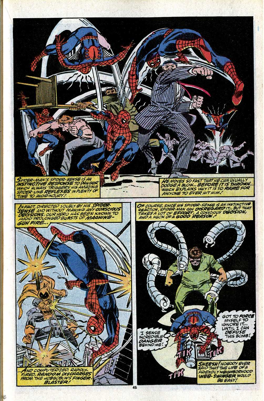 Spider-Man and his clone Ben Reily have defeated the signifigantly stronger villain for Carnage by remaining agile and striking him without return for several minutes and Spider-Man avoided Doctor Octopus's tentacles in just such a way as to tie them up. He also once jumped off a building and changed into his civilian clothing before he reached the ground.