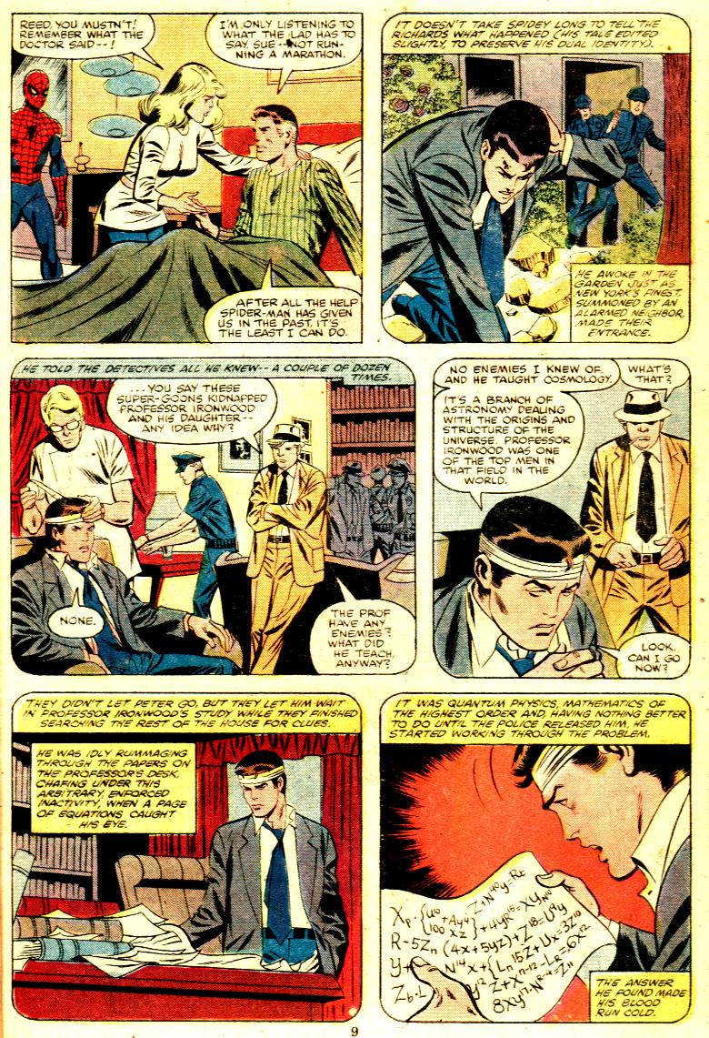 Outside the biological Spider-Man is also a supergenius in the fields of math and physics. I already linked the feat where Spider-Man says he can do an unbelievable amount of calculations in his head on the fly however beyond that Spider-Man in freefall from orbit did the calculation in his head of how to fall to hit Paris on the ground, improved the Drake Equation was able to help ultimate universe Iron Man solve the equation of interdimensional travel (and bear in mind that in the ultimate universe, Iron Man atleast considers himself smarter then Reed Richards), and in seconds fixed an equation in the Wakandan Calculus used in the creation of imperfect reverbium that was exponentially reflecting energy threatening everyone there. Doctor Octopus had 5 minutes to solve the same equation and failed to do so. Spider-Man was able to solve a high order math/physics problem just because he had nothing better to do, the equation being an equation for an anti-matter bomb. Spider-Man can understand at least the basics of meta-science, the science behind all science, something very few minds in the Marvel Universe can do. He can do this to analyze large amounts of statstical data to figure out what is going to happen next, similar to psychohistory in the Foundation series, although his feats aren't quite as good as that with it. He developed a better theory and understanding of probability distibution and chaos theory then Doctor Octopus' doctoral thesis simply based on analyzing the motion of Doctor Octopus' arms, was able to solve a fake alien invasion before Iron Man did and was able to analyze data and figure out The Collective's power before Iron Man could.
