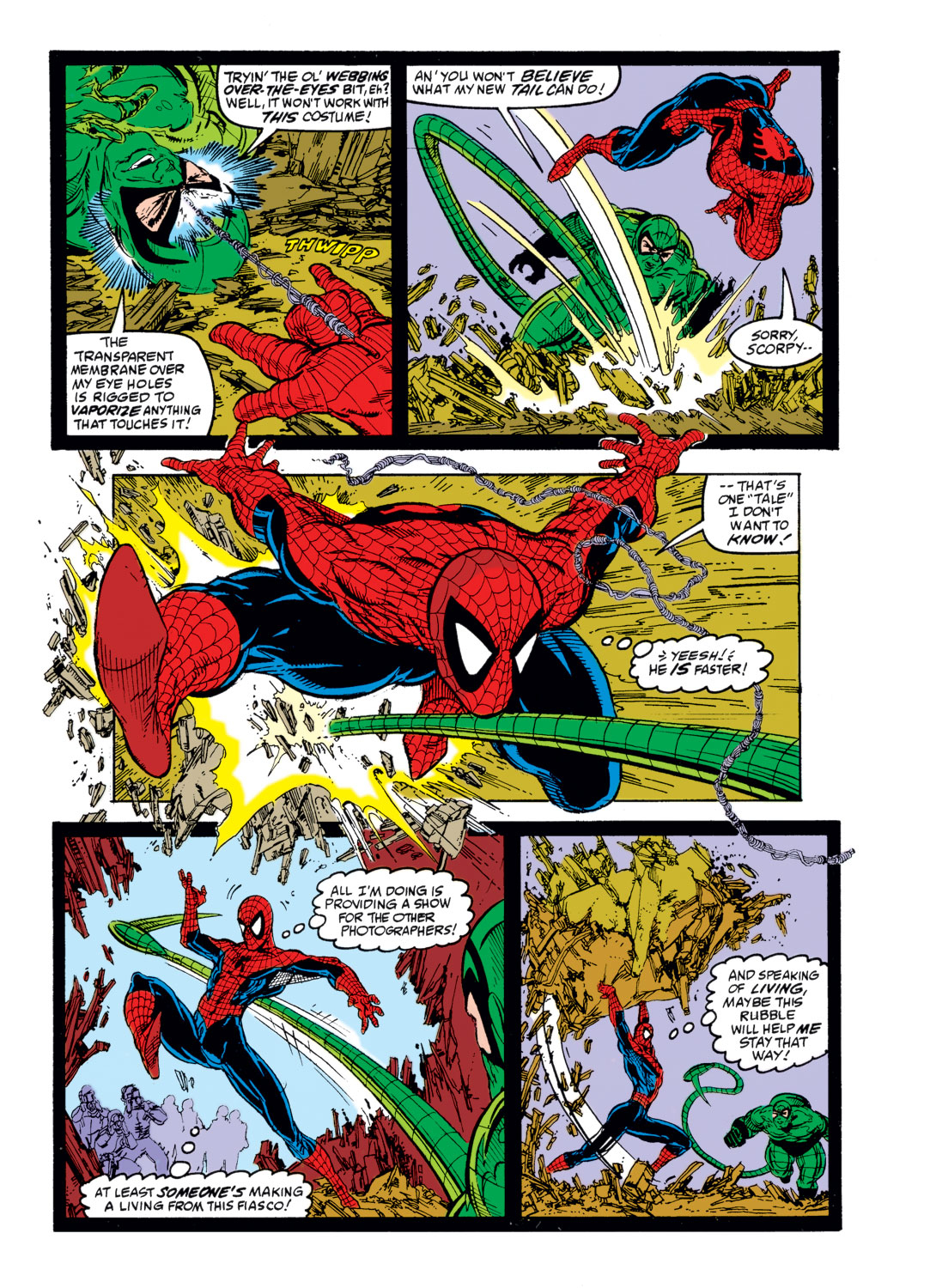 This is relevant because Doctor Octopus and possibly Hammerhead have one of the best feats for the Spider-Man characters. The two were fighting and Hammerhead hit the nucleur reactor they were fighting on, somehow causing an atomic explosion. The explosion creates this massive fireball and mushroom cloud and obliterated the entire island they were on. I'm not sure if this is a feat for Hammerhead because I don't know how or even neccesarily if he survived it. He shows up again later acting all ghostly but instead of saying he died he states the explosion blasted him "out of phase". I don't know if that means he survived or not. The Marvel wiki claims he was killed so I don't feel comfortable using it as a feat. What is a feat however is that Doctor Octopus' mechanical arms wrapped around him when the explosion hit and protected him, remaining completely unharmed from the atomic explosion (though somehow were permenantly grafted to him from it). This has been calced to triple digit ton of tnt, though I think realistically given their lack of damage and the sheer violence of the explosion it's more likely in the kiloton range. Either way, this is important because Spider-Man was able to tear off these arms, damaging them more then the nuke did with his raw strength and another time violently breaking them. However other Spider-Man villains also have feats at this range as well.