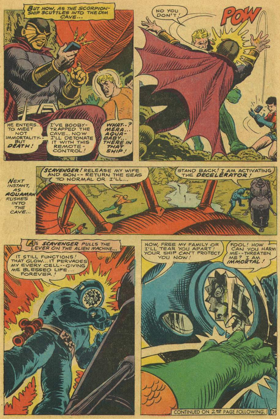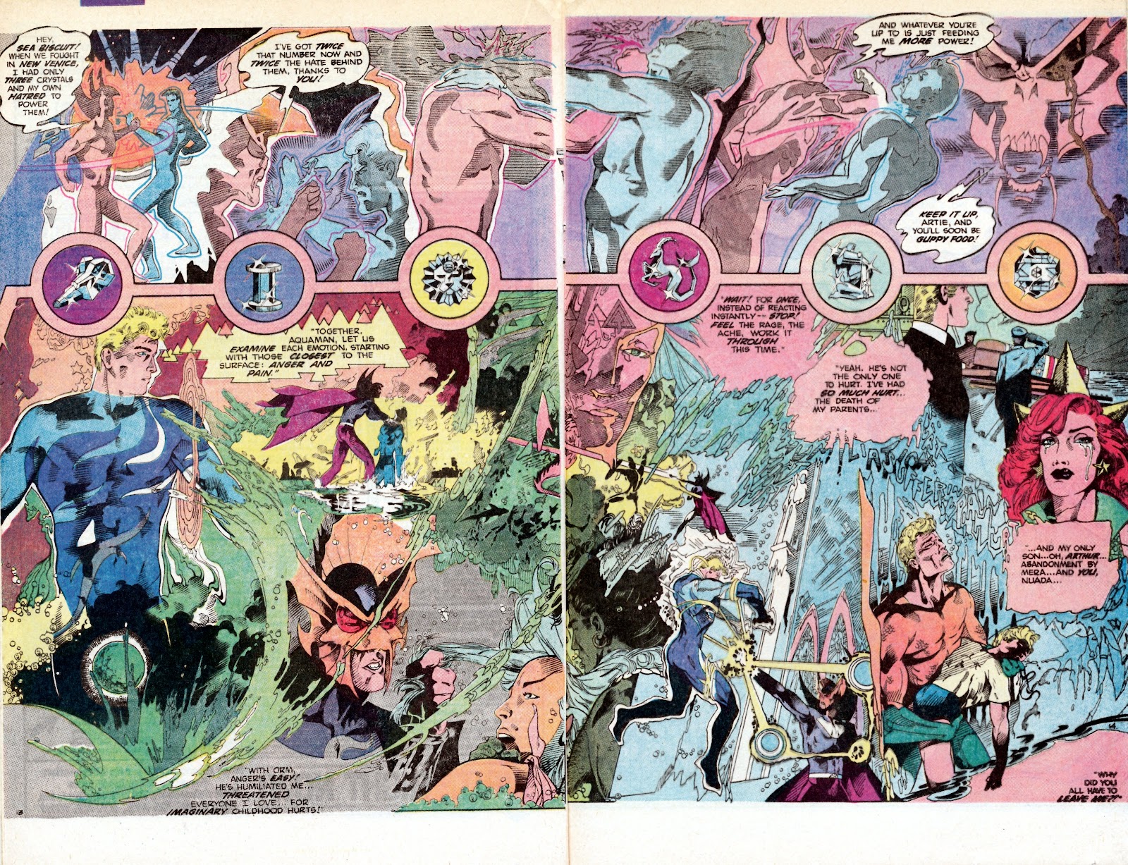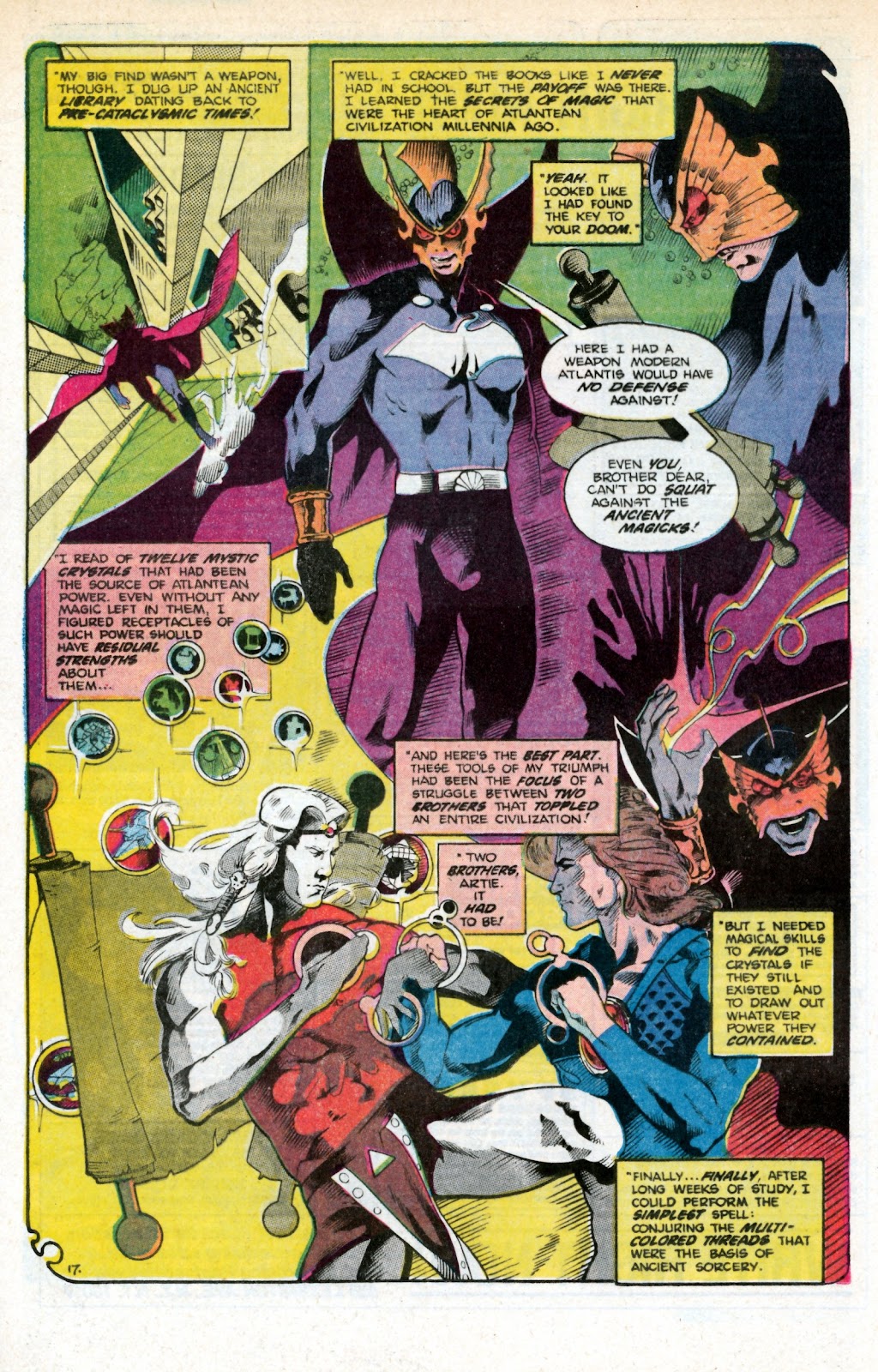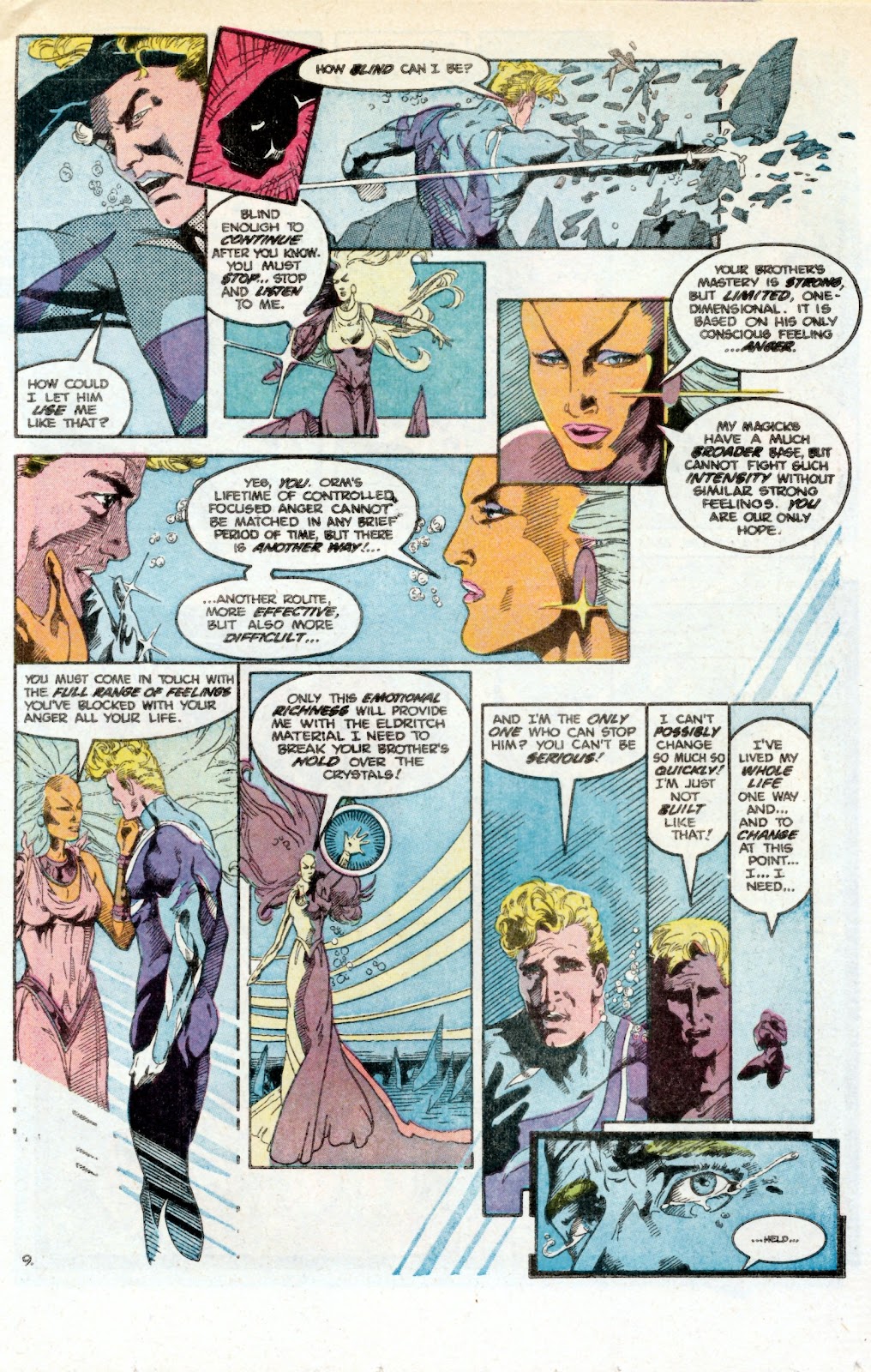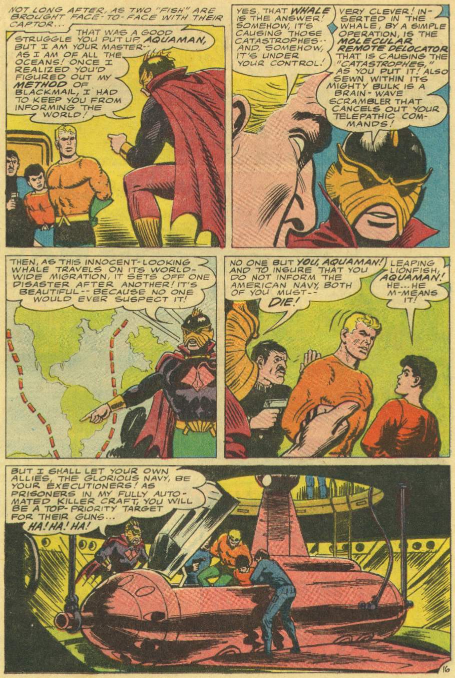 Orm painfully got to his feet and hobbled towards his prone enemy. "That Jellyfish...was designed...to stop Aquaman" he said painfully. "It cuts off psychic powers...." Orm grinned thinking of what power would now be his. "Now your power will be mine.... let us see where it comes from..." and despite Gaito's struggles in protest, Orm reached his position and his mental body slipped into Gaito's mind.