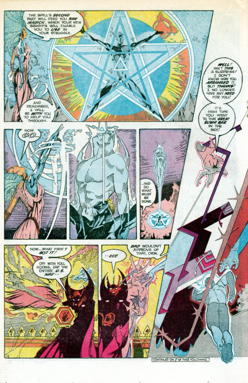 Orm painfully stood, blood gushing from his side, his armor broken, his body weary, his whole body weak, his whole spirit wavering. Pained, he held aloft his trident. "Atlantis..." words flowed like a small stream in his mind against the ocean of experience, of chaos... "This boy threatens the sea and the land together.... Tommy...." Orm's mind raced to the boy who had once called him father..... "Atlantis....please....if ever you will.... GRANT YOUR LOYAL SON YOUR POWER!"