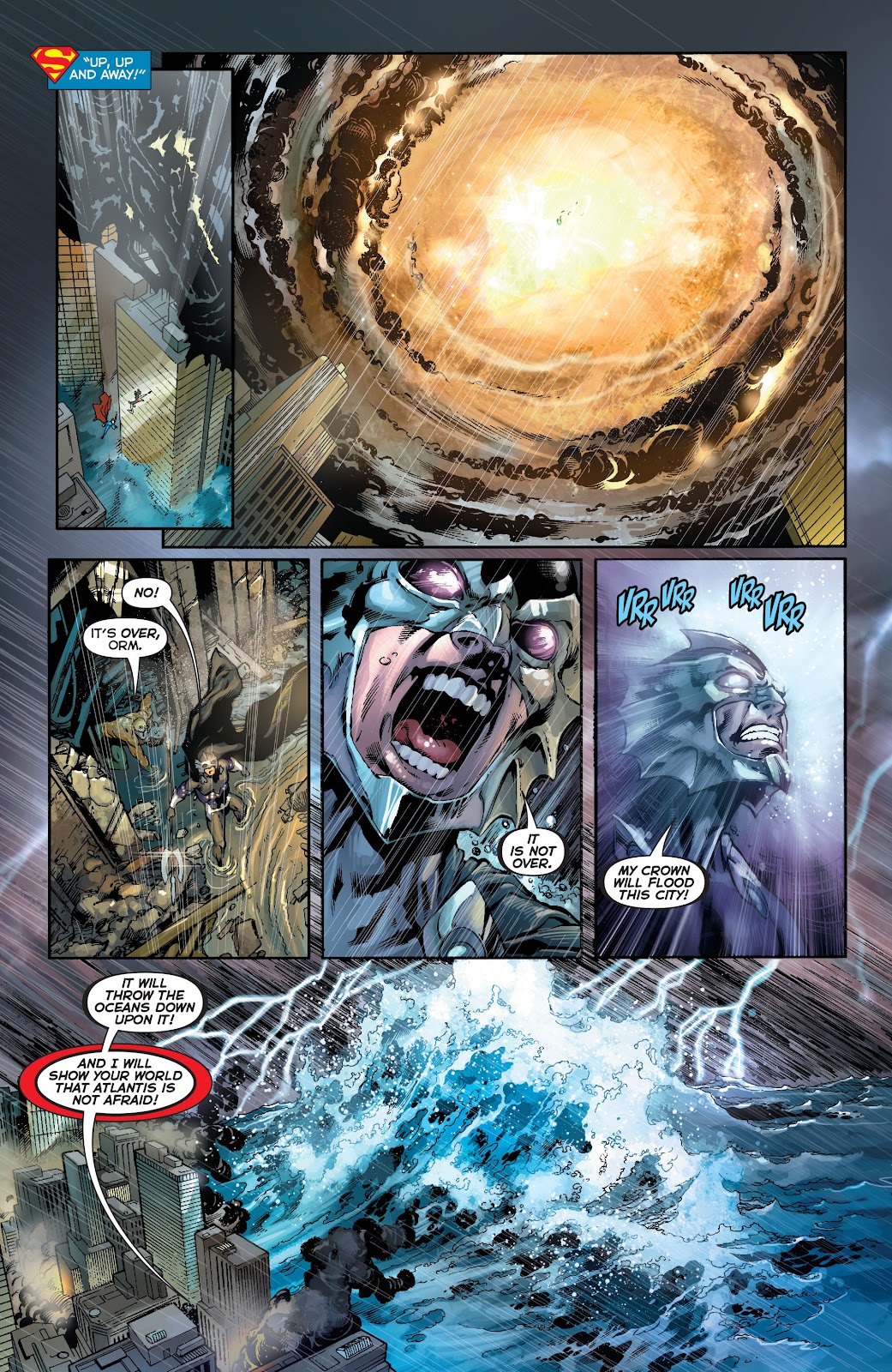 While Orm's crown controls water, his trident conjures lightning. His magical lightning was able to harm an Early New 52 Superman and Wonder Woman. This took place during the Justice League: Throne of Atlantis storyline from November 2012 to February 2013. December 2012 New 52 Superman would, in his own series, lift the weight of the Earth for five days without sunlight suggesting this lightning could have planetary level potency, although it may just be Superman's "weakness" to magic. If it was however, you'd think it wouldn't work on Wonder Woman who was treated as a peer to Superman in durability but has no weakness to magic.