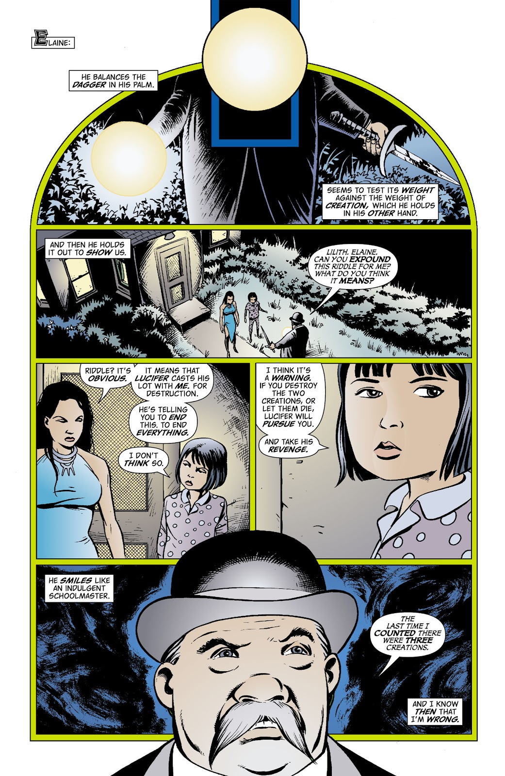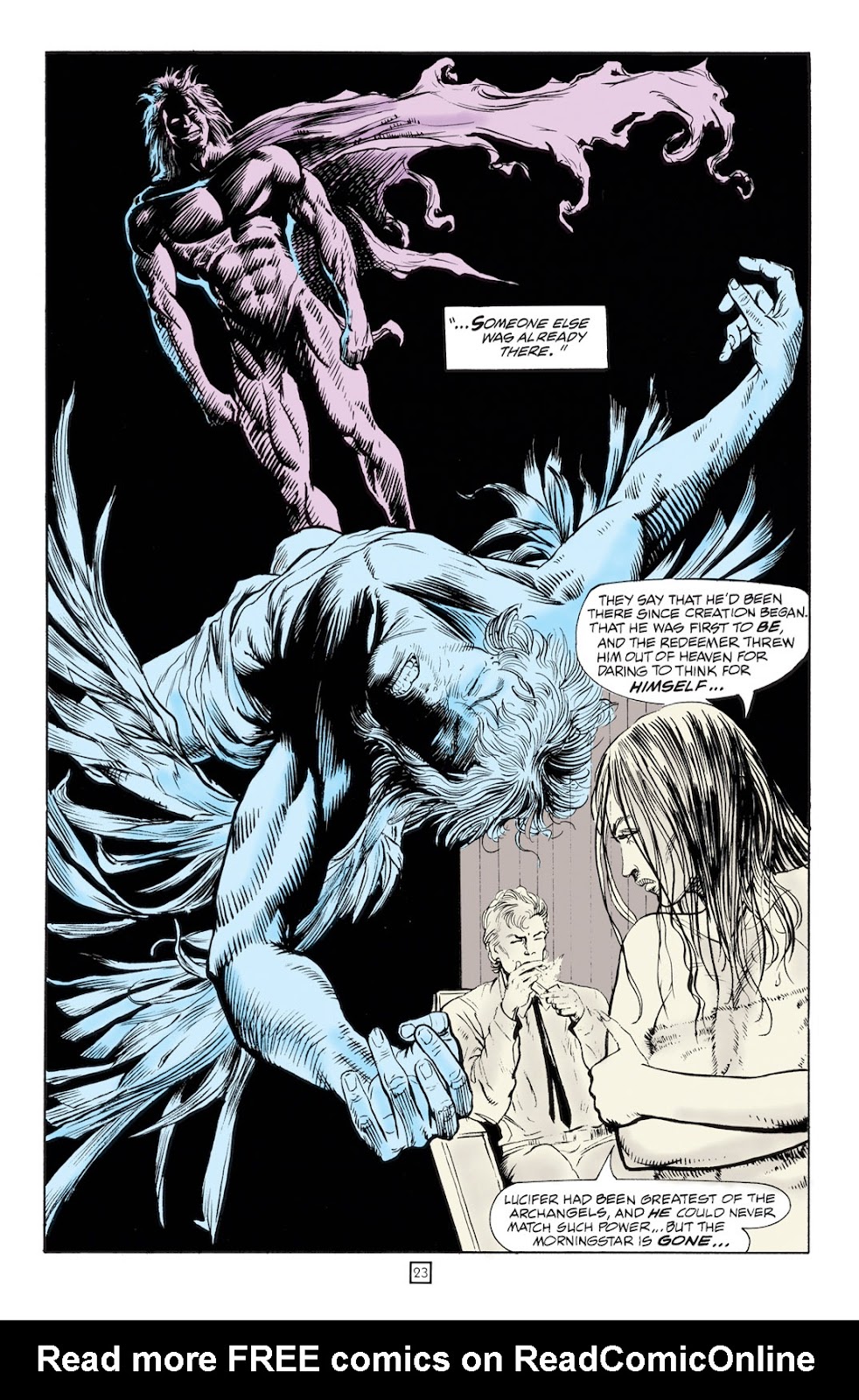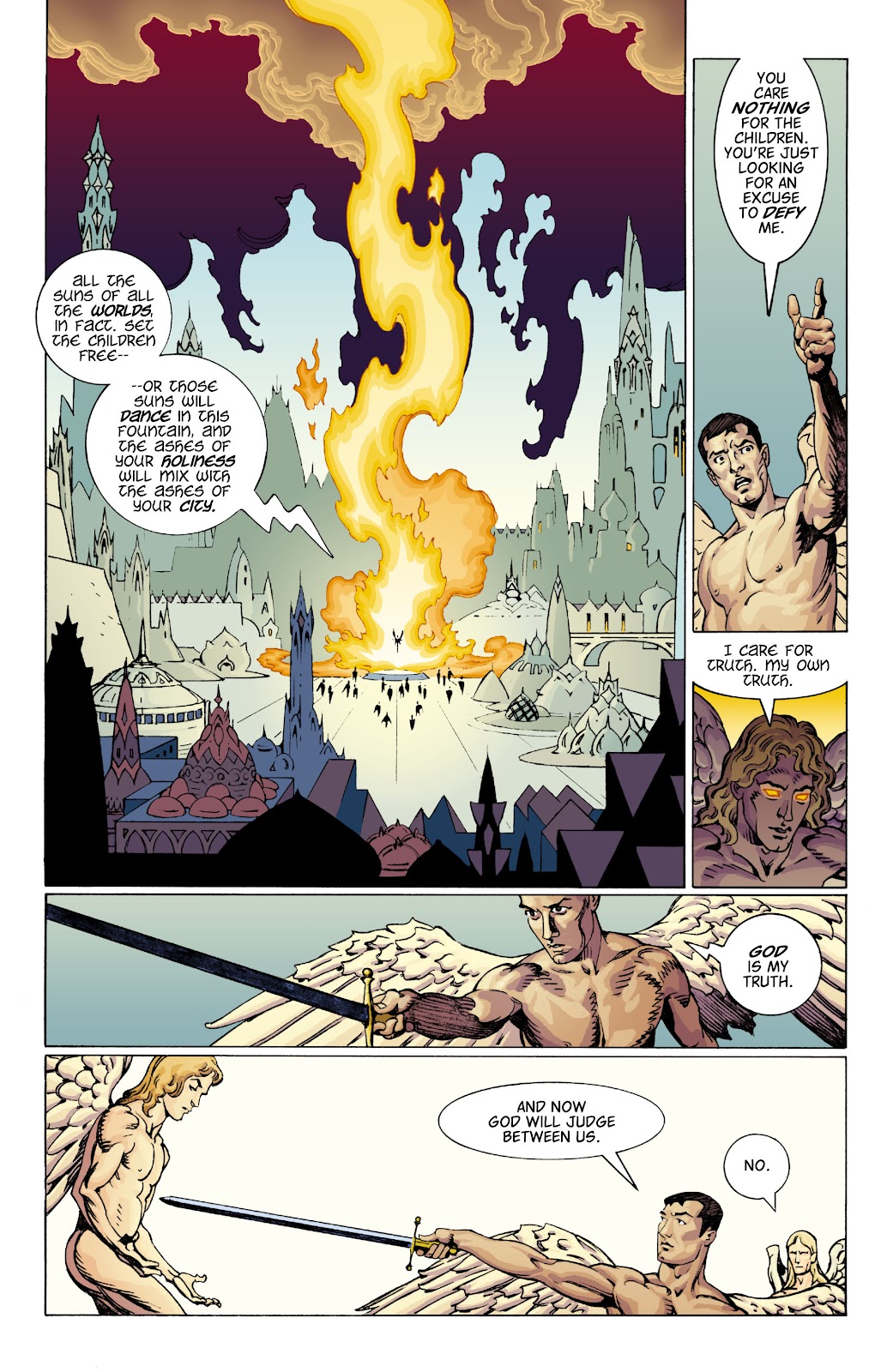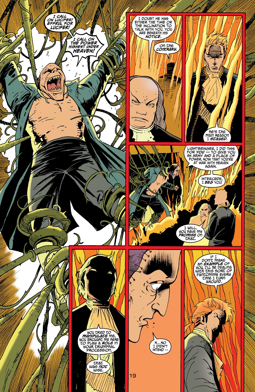 Despite how powerful he is, Lucifer does have some pretty clear weaknesses. He does not have the absolute power of Michael. This means he can't create something from nothing and that while he is one of the most powerful entities in DC Comics, his power is not absolute. He can and has been overpowered, most famously by his brother Michael in the War in Heaven, and de-powered. Most often, seemingly due to his association with Hell, Lucifer is consistently depowered by holy or divine powers. Etrigan as a baby was able to harm Lucifer by shooting him with fire in a cross shape and in the realm of the Shinto Kami, Lucifer was completely powerless and mortal. He should hypothetically have the other demon weaknesses such as silver or mystical cold, though those don't seem to be nearly as extreme and to threaten Lucifer with those, one would need to be relatively close to him regardless. Lucifer also has a specific limitation in regards to destiny or fate manipulation. The Basanos, a flawed imitation of Destiny of the Endless' power were a threat to Lucifer. This is a part of Lucifer's overarching narrative. As a being with absolute willpower but not absolute power, his power to his perception amounts to zero, and he is trapped to the plan of the Presence. After escaping the Void at the end of Volume 1, it seemed initially that he had escaped this weakness, but in Volume 3, he is is once again enemy of fate. Even at the end of Volume 1, The Presence compares Lucifer and himself to Sun Wukong and Buddha
