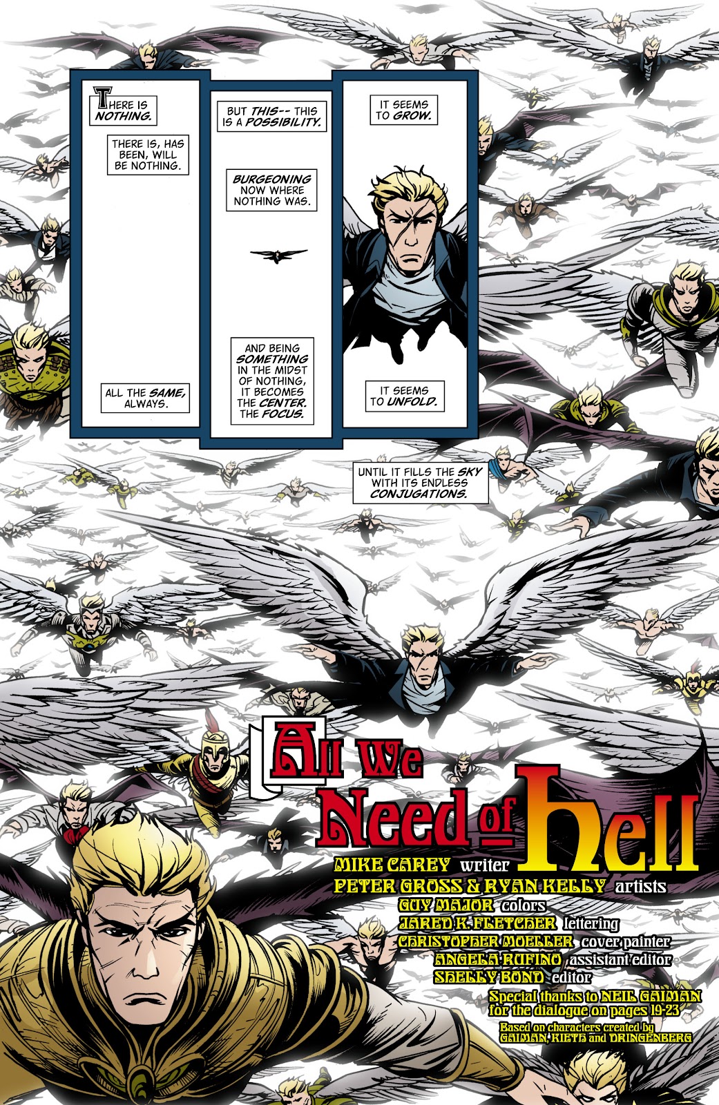 While Lucifer HAS a body, he is not his body. Flesh means very little for Lucifer, as he is not made of it. The angels are non-physical, they are essence without shape, energy without the bounds usually set. Lucifer existed before creation, in the void, transcending all concepts and stories. Lucifer's being, his position is absolute, to the point that even the comic reader does not have a perspective more absolute than him. Likewise, even if the Presence let all creations, bearing all concepts and stories end, Lucifer would persist, which makes sense as he predates them all. When his brother Michael "died", though it didn't stick, he released the Dunamis Demiurgos a power which can destroy all creation, the absolute power of God. Lucifer tanked it. He also persisted in Michael's power on another instance.