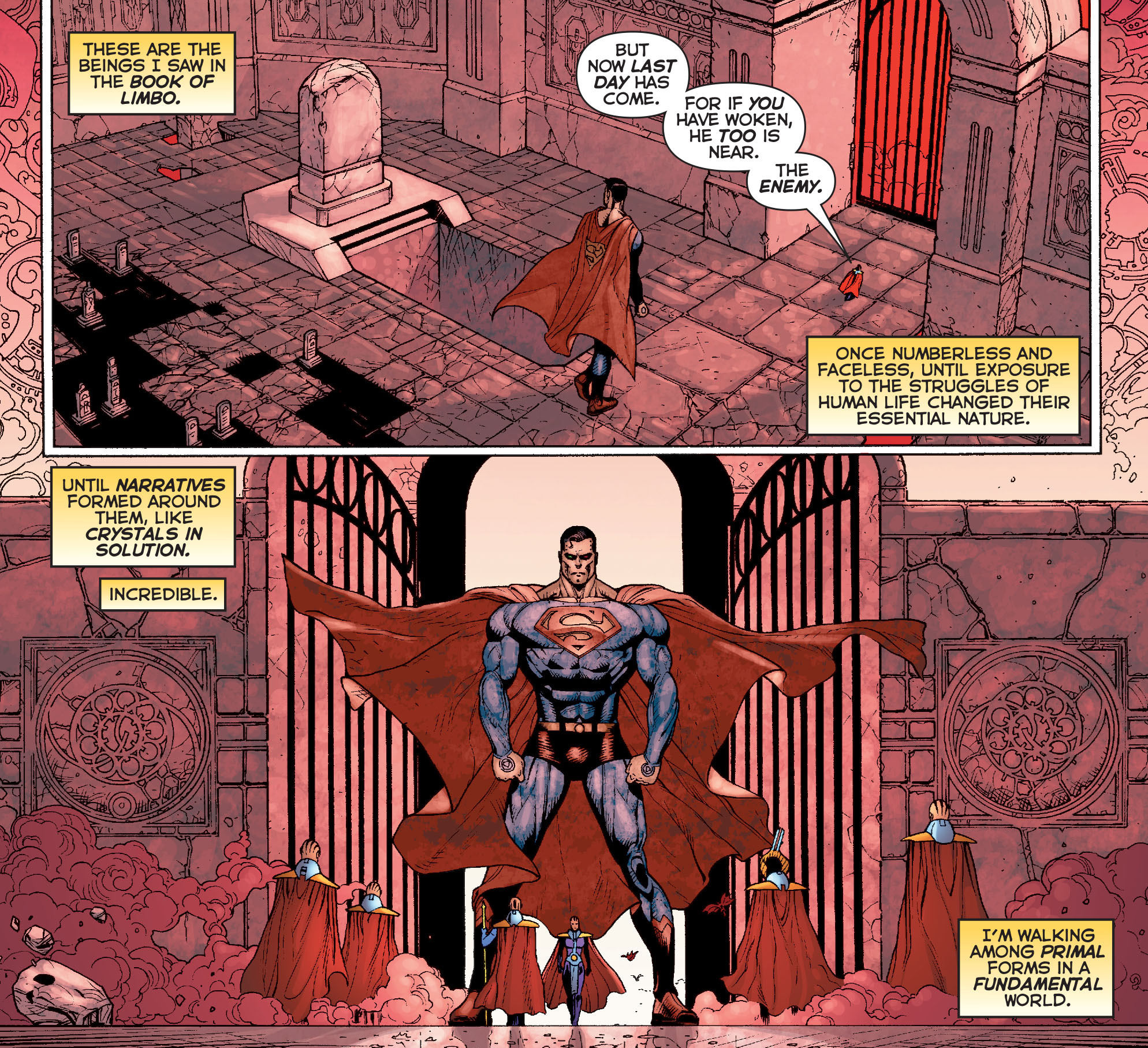 Reality is filled with tiny elemental and biological elements; tiny drops of water, small flowers, gentle breezes. These are a part of one of the shallowest layers of something called the Elemental Realms, with each layer growing more profound, extending into the metaphysical realms mentioned before, with their absolute extent extending even into the Absolute. Manipulation of these elemental realms can allow for the attainment of enlightenment and oneness with the unbroken oneness, God, the Overvoid, the Source, The Presence, an event that has happened twice before. After Animal Man attained oneness with the Red, he came to enlightenment, realizing everything is part of a whole, becoming the whole in its entirety; the body of God, and the soul of the world. Similarly, Swamp Thing after merging with the Elemental Realms temporarily re-attained the unbroken one-ness before all things, becoming one with all things, the absolute. This is a reference to the Neo-Platonic basis DC Comics cosmology is vested on, that before everything was the perfected Oneness, emanating down into lesser and lesser shadow realities and that through contemplation and meditation one can re-ascend even to the point of losing one's self participating in that final absolute sweep of existence.