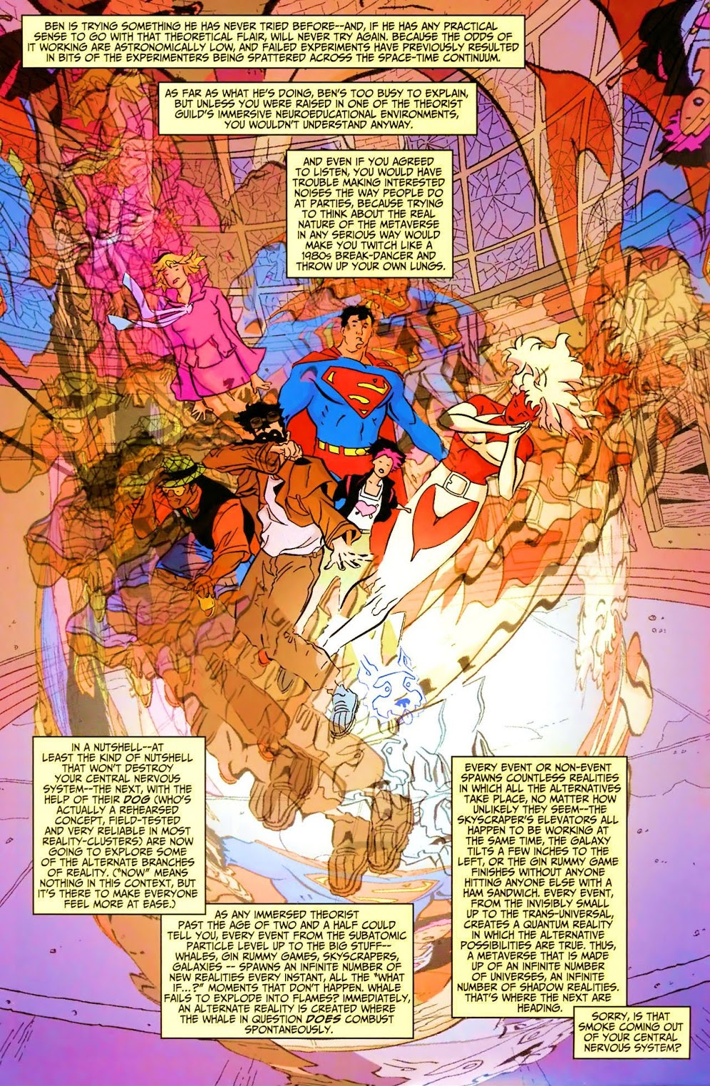 The universes of DC Comics are like germs in a massive bloodstream, an infinite pool of blood called by the people in the multiverse "The Bleed" representing the lifeblood of the stories. The Monitors, the overseers of creation from the fifth dimension realm Nil refer to the substance as "Ultramenstruum" and it can grant them the powers of healing and annihilation manipulating and feeding off the Bleed like a race of celestial vampires. It is referred to as the substance of life itself and it's been described by Mr. Mxyzptlk that the lifeblood of the multiverse is actually imagination itself, something implied at least since Final Crisis with the vampiric monitors representing parasitic writers and editors draining the creativity and life out of the stories of the DC Multiverse.